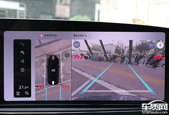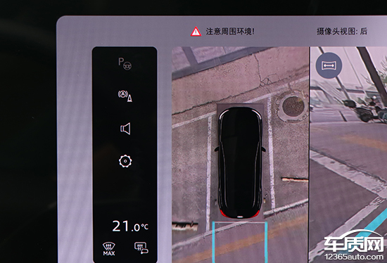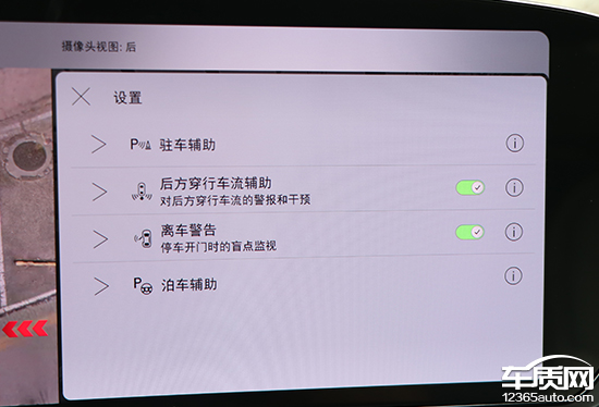 评测车配备360°全景影像以及透明底盘/540°影像,支持多角度显示。实测来看,在白天光线条件比较充足的情况下,虽然还是能够看出一定的颗粒感,但是情况并不严重,画面清晰度表现尚可,畸变控制令人满意。此外,影像画面内还带有随动倒车辅助线,能够为驾驶员提供参考。设置界面内,包括后方穿行车流辅助和离车警告均支持关闭,给予了用户更高的选择自由度。