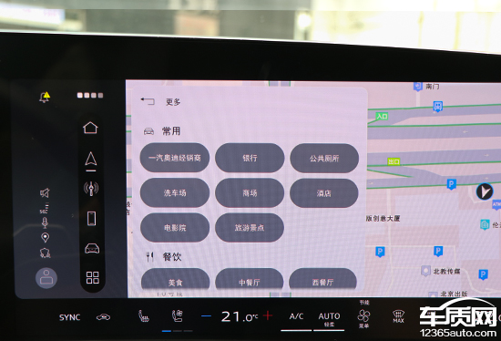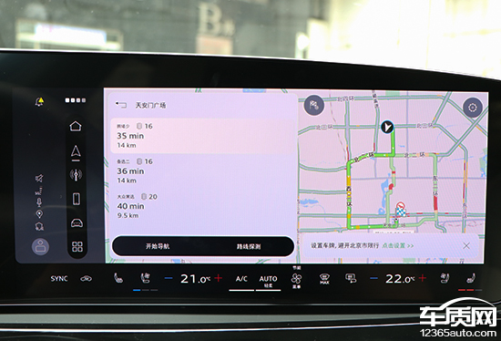 评测车内置高德地图,车机版与PC版整体区别并不大,界面布局比较常规,搜索栏位于左上角,支持多种输入方式,操作简单方便。值得一提的是,如果车辆当前油量较低,那么在导航页面的左下角会出现警告,并询问是否需要导航至加油站,这个小设计确实贴心又实用。