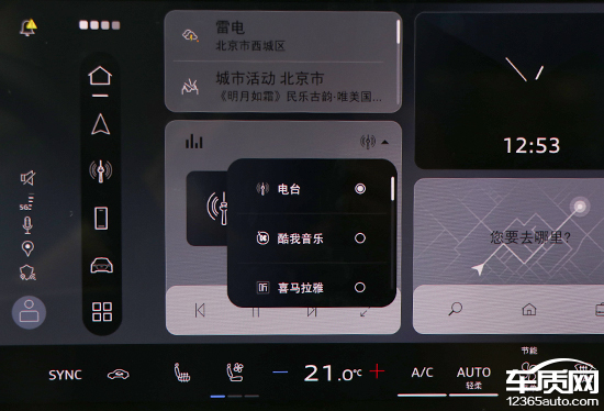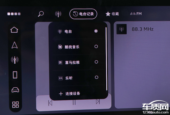 多媒体部分,车机系统内提供原生FM/AM广播,支持添加频道以及编辑列表。此外,其他音源的选择也相当丰富,包括酷我音乐、喜马拉雅、乐听以及连接设备。