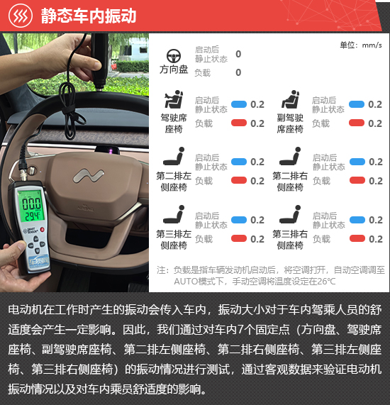 在静态车内振动测试环节,启动后静止和负载两种状态下,2025款乐道L90方向盘位置的振动数值始终为0,前后排座椅的振动数值均为0.2mm/s,体感不明显。