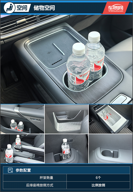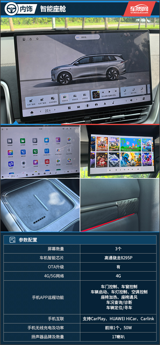 配置上,评测车配备15.6英寸中控屏,内置eπ OS车载智能系统,支持CarPlay、HUAWEI HiCar、Carlink多种手机互联方式;在高通骁龙8295P芯片的加持下,车机整体响应很迅速。15.6英寸后排娱乐屏的加入,使第二排、第三排乘客也能拥有出色的娱乐体验。同时,评测车可实现四区域语音唤醒识别,可以语音控制导航、电话、空调等功能,双AI大模型智能语音助手让每次沟通都像老朋友一样默契。值得一提的是,评测车配备了17个喇叭,支持WANOS全景声,随时都能在车里享受一场听觉盛宴。中控台上方设置了一个手机槽,拿放手机十分方便,同时具备50W手机无线充电功能。