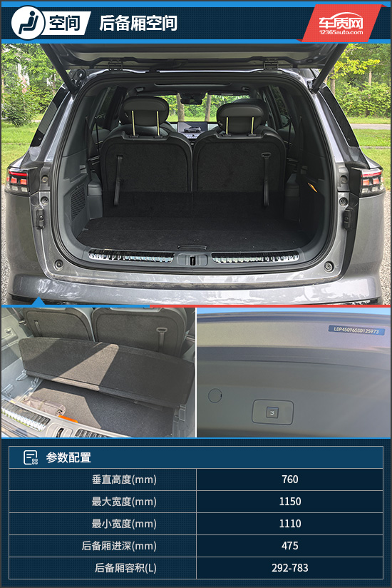 评测车的后备厢内部较为规整,在第三排座椅打开的状态下,放置2-3个登机箱不成问题。而将第三排座椅放倒后容积能达到783L,可放置大件物品,另外,盖板下方还有隐藏储物空间,方便对零散物品进行收纳,保持后备厢干净整洁。