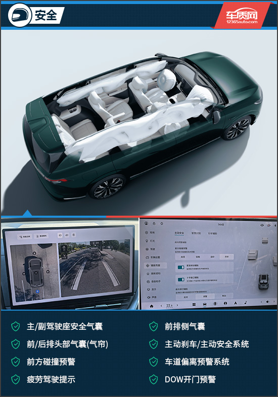 评测车配备了完善的主被动安全配置,包括主动刹车/主动安全系统、前方碰撞预警、主/副驾驶座安全气囊、前排侧气囊、前/后排头部气囊(气帘)等均没有缺席,整体表现十分出众,保障了每一位乘客的出行安全。