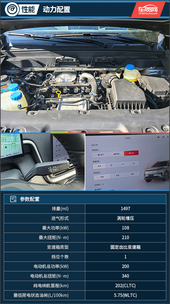 动力系统方面,评测车搭载1.5T涡轮增压发动机和后置单电机组成的混动系统,发动机最大功率108kW、最大扭矩210N·m,电动机总功率200kW、总扭矩340N·m,匹配容量为34.32kWh的磷酸铁锂电池,CLTC纯电续航里程为202km,综合续航超过1220km。