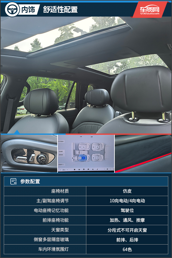 舒适性配置方面,评测车虽然采用仿皮座椅材质,但座椅填充物柔软且支持多向调节,再配合前排座椅加热、通风、按摩功能,舒适体验出众。天窗类型虽然为分段式不可开启天窗,但开启遮阳帘后的车内通透性不错,加上前/后排侧窗多层隔音玻璃,在日常乘坐中可以为车内乘员提供一个明亮静谧的环境。