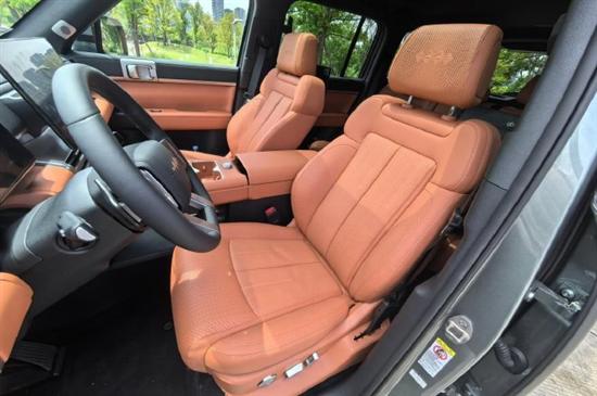 驾驶座椅宽大厚实,有着这个级别车型该有的厚度以及体积,就像一个小沙发,真皮覆盖的表面手感很好,竖向的缝线显得很是高档。而在功能上也是应有尽有,它带有电动调节、加热、通风,前排也提供电动调节腰部支撑,还有按摩功能。