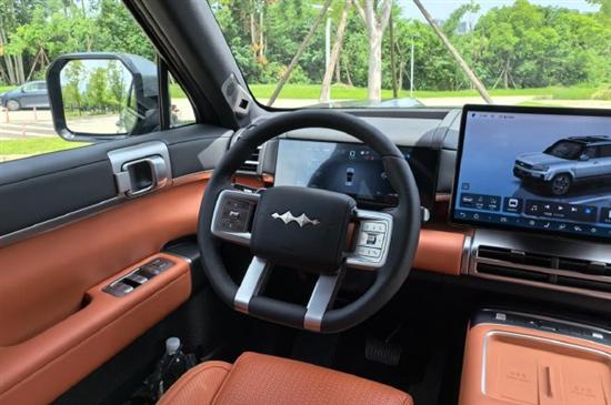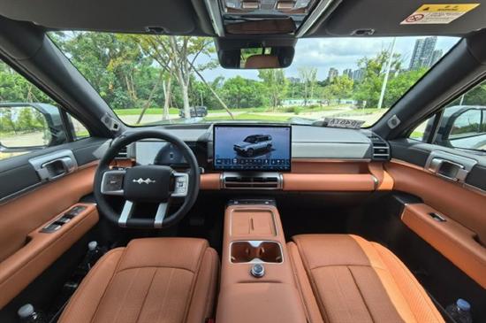 内饰造型延续了外观的造型,整体规整细节设计有灵感,但并不会特别的出挑,采用了独立的仪表盘+悬浮式中控屏的常规双屏设计,车机支持屏幕之间联动。中控台大面积采用方正的轮廓线条,但线条的圆角塑造是较为柔和的,硬派新能源的气息显得更足,车内同样并没有太多的实体按键。方程豹钛7为消费者提供了三种不同的配色选择。而在材质方面,新车细节之处增加了很多雾银色装饰点缀,软质材料的应用面积挺大大,而且多数都是皮质包裹。
