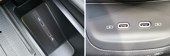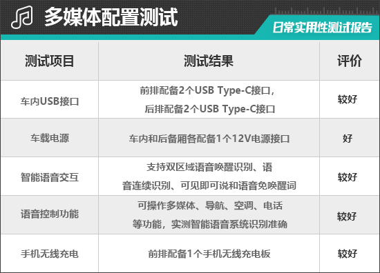 评测车配备4个USB Type-C接口;其中,前排2个USB Type-C接口位于前排杯架前方,后排2个USB Type-C接口位于空调出风口下方;接口布局合理,但兼容性一般。此外,前排中控台下方还提供1个12V电源接口,能够满足车内乘客多种电子设备的用电需求。