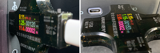 此外,我们对USB接口进行了测试。其中,前排USB Type-C接口充电功率为11.4W、电压为9.11V、电流为1.25A,后USB Type-C接口的充电功率为5.95W、电压为5.15V、电流为1.15A。
