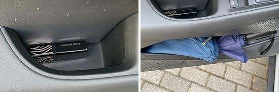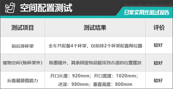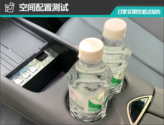 对于车内使用空间的测试,只针对前排触手可及的空间,不包括手套箱、中央扶手箱等需开启的空间。测试方法是将以下固定物品全部放置在前排的各个储物空间内,通过固定物品的放置情况来判断车辆储物空间的表现。测试选定的固定物品为:2瓶常规大小的矿泉水、1部大屏手机、1支口红、1个挎包、1副墨镜、1把折叠雨伞以及1包常规尺寸的抽纸。