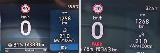 在实际测试中,将车内空调温度调至18摄氏度,并开启经济模式。行驶路线途经城市道路和环路,平均车速为30±2km/h。到达目的地时,车辆表显的公里数增加10km,续航里程减少20km,即平均每行驶1km消耗的续航里程约为2km。