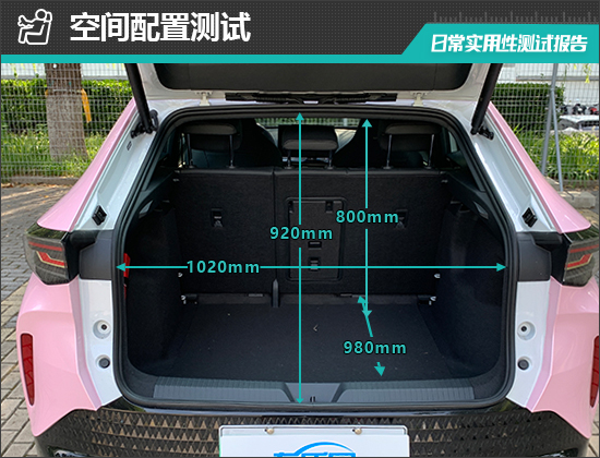 后备厢内部造型较为规整,地板平整度不错。后排座椅支持比例放倒,放倒后可以进一步拓展后备厢空间。对于评测车后备厢的基础数值,我们也进行了实测,开口长度为920mm;开口宽度为1020mm;后备厢进深为980mm;后备厢地台与顶部的垂直高度为800mm。