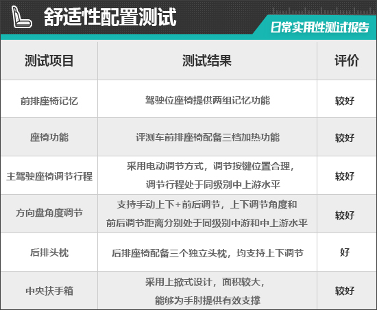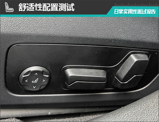 座椅方面,评测车主驾驶座椅电动调节按键位于座椅侧面,位置合理。此外,评测车驾驶位座椅支持两组记忆功能,前排座椅配备三档加热功能,整体配置表现与车辆的定位相符合。