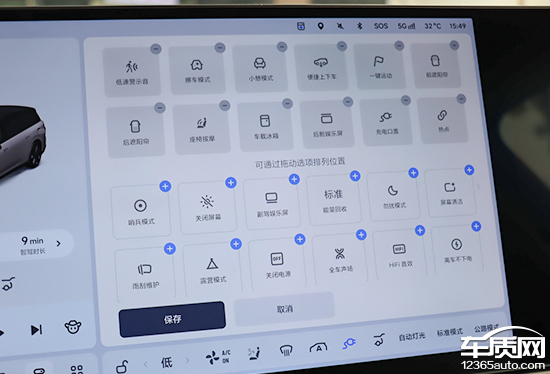 屏幕下拉菜单页面设计简单清晰,除了常用的屏幕亮度、声音大小、座椅位置调节外,还配备了很多其他功能的快捷开关。页面支持自定义,可选内容十分丰富,通过拖拽图标即可完成修改操作。