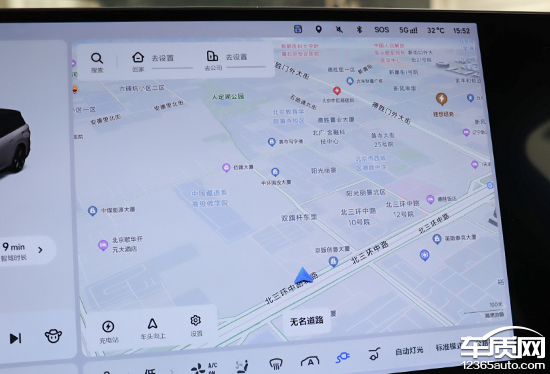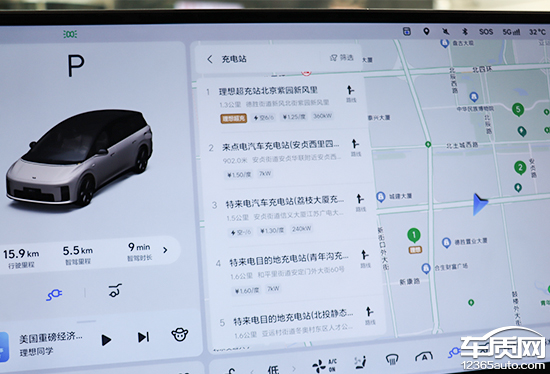 评测车内置高德地图,界面布局比较常规,搜索栏位于左上角,支持多种输入方式,操作简单方便。除了预设的“回家”和“去公司”外,还可以在屏幕左下角快速搜索充电站,这个功能对于一款纯电车型来说确实非常实用。