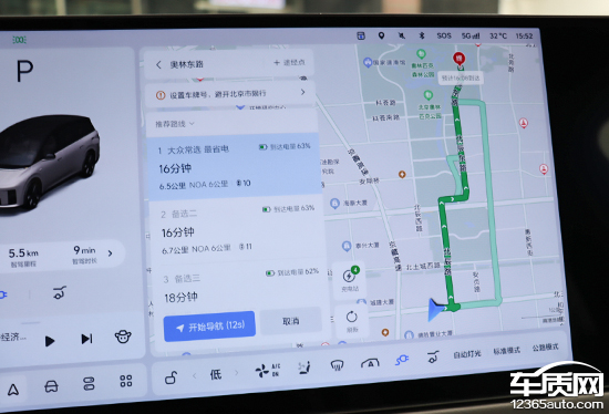 确认目的地后,系统会提供三条路线选择。基于车联网,导航界面可以显示路线的拥堵情况,为驾驶员提供参考。值得一提的是,由于不同的路线选择在行驶里程及路况方面有所区别,因此系统会根据实际情况计算到达时车辆的剩余电量。虽然只是一个很小的细节,但是日常使用感受很好。