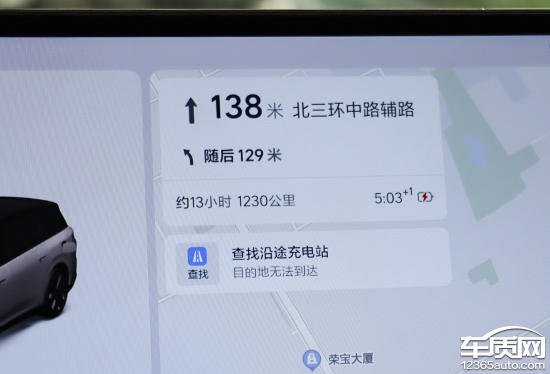 实测来看,如果目的地行程较远,车辆剩余电量无法抵达,那么导航界面就会主动显示“查找沿途充电站”。此时,用户只需点击图标,系统就能结合实际路线搜索沿途充电站并进行重新规划,十分方便智能。