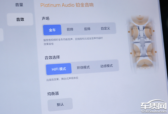 评测车搭载Platinum Audio铂金音响系统,由于选装了后舱娱乐屏套装,因此扬声器数量达到22个,原厂标配的扬声器数量为20个。除了出色的硬件配置,其在软件层面的调节也十分丰富,包括声场、音效选择以及均衡器。