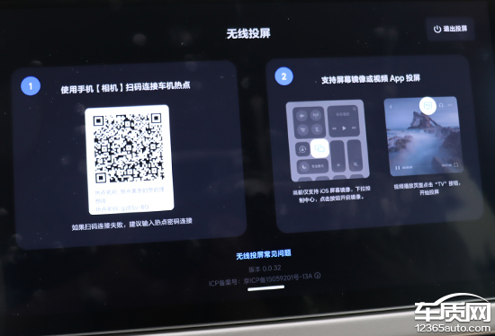 车载互联部分,评测车配备5G网络,支持车联网、OTA升级、Wi-Fi热点以及手机APP远程功能。实测蓝牙的搜索及连接速度均相当不错,体验感较好。此外,系统还支持无线和有线投屏。其中,无线投屏仅支持iOS屏幕镜像,对于苹果手机比较友好。