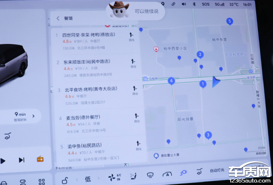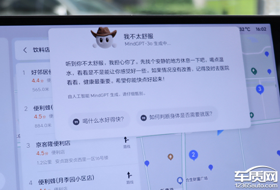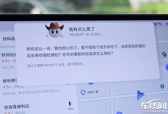 实测后发现,当说出“我有点饿了”以后,系统会查找附近的餐厅,导航前往十分方便;系统对于“我有点渴了”的模糊语义并不能理解,需要更为清晰的指令,例如查找附近便利店。如果说“我有点累了”或“我不太舒服”,系统便会接入大模型,给予用户更加拟人的反馈。总体来看,系统对于模糊语义识别完成度较高。