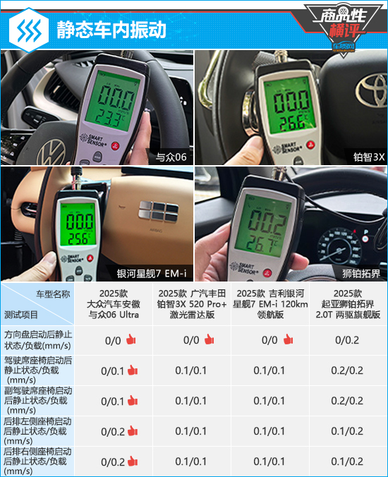 在静态车内振动测试中,与众06的整体表现最好,不仅方向盘位置在两种状态下的振动数值始终为0,前后排座椅的振动数值也控制在较低水平。铂智3X和星舰7的测试数值完全一致,表现也值得点赞。相对而言,狮铂拓界这个唯一的燃油动力车型表现相对逊色,不过由于车内各部位的振动数值并不高,因此对乘坐舒适性影响不大。