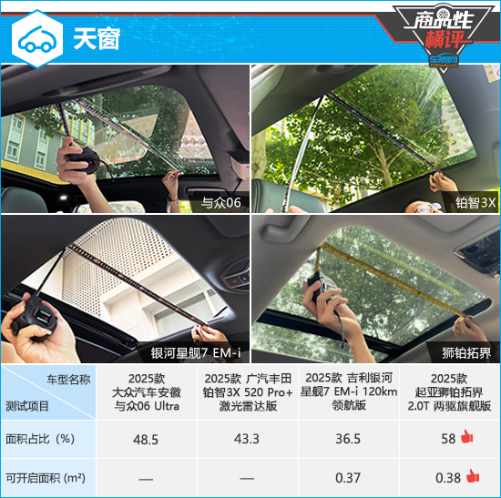在针对天窗的测试中,只有星舰7和狮铂拓界的天窗可以开启。其中,后者的整体表现最为优异,面积占比和可开启面积均在四款车型中保持领先。