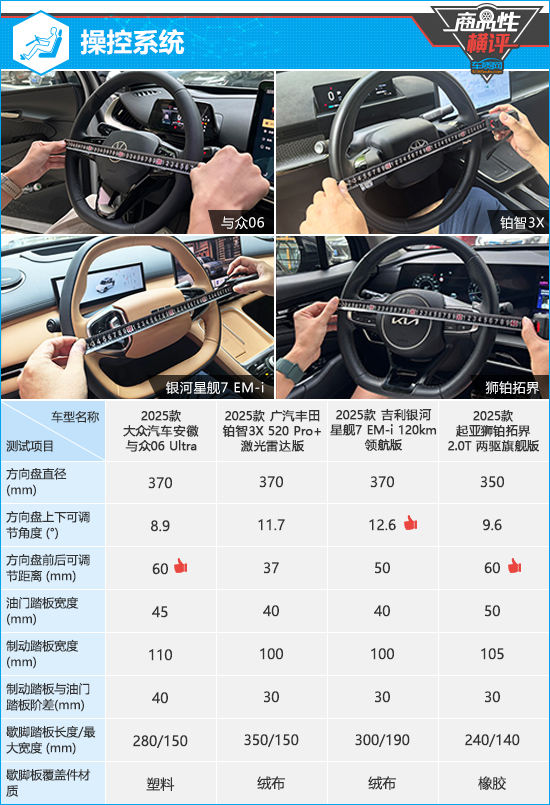 在操控系统方面,除狮铂拓界的方向盘尺寸略小外,其余三款车的方向盘直径均为370mm,可兼顾操控稳定性和灵活性。方向盘调节方面,星舰7在上下可调节角度测试中处于领先地位。与众06和狮铂拓界的上下可调节角度表现一般,但好在两者在方向盘前后调节距离扳回一城,均达到60mm。相比之下,铂智3X的方向盘前后调节距离表现最差,仅为37mm。