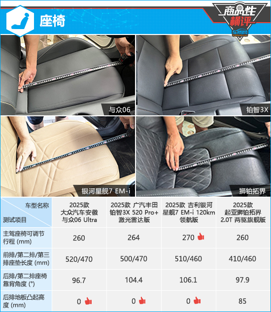 在座椅配置方面,根据已测得的数据来看,银河星舰7 EM-i的主驾驶座椅行程调节范围较大,可以满足大多数驾驶者的驾驶习惯。