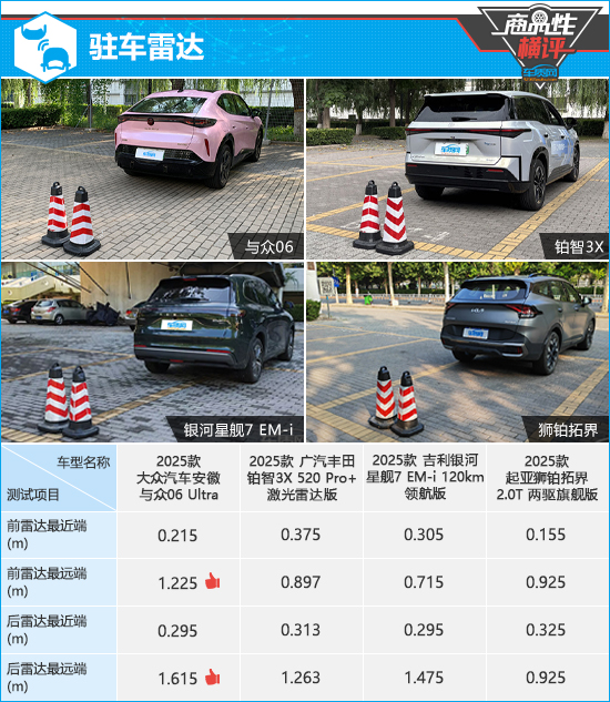 在雷达感应测试中,根据已有测试数据来看,无论是前雷达还是后雷达,探测能力最强的都是与众06,相比之下,狮铂拓界的雷达功率明显偏弱,均未超过1m。在持续蜂鸣阶段提示距离方面,星舰7的前、后雷达测试成绩均接近同级别平均水平,表现相对较好。