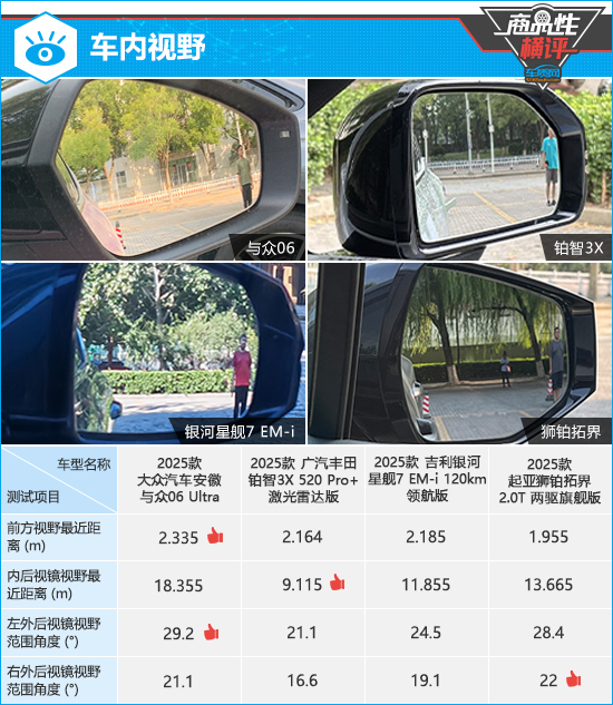 在外后视镜视野范围测试中,与众06和狮铂拓界左侧外后视镜测试成绩均达到同级别上游水平。相比之下,铂智3X的两侧外后视镜测试成绩均在四款车型中垫底,且未达到同级别车型测试均值,视野盲区相对较大。