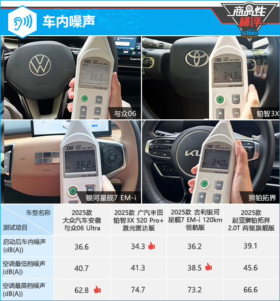 在空调最低档和最高档噪声方面,星舰7和与众06分别取得领先,实测噪声值均优于同级别车型测试均值。