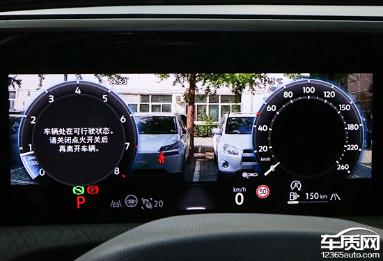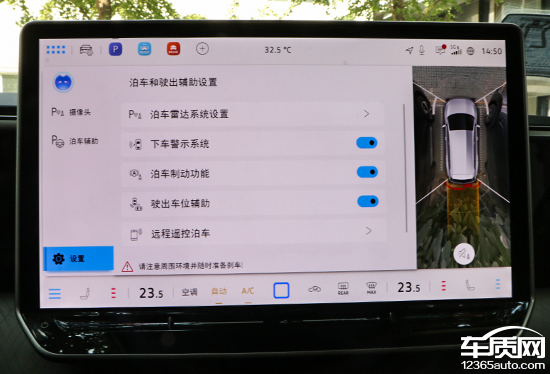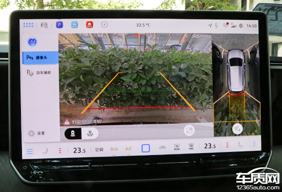 评测车配备360°全景影像,支持多角度显示。实测来看,在白天光线条件比较充足的情况下,画面清晰度表现不错,而且畸变控制也能够令人满意。影像画面内带有随动倒车辅助线,能够为驾驶员提供参考。设置界面选择丰富,涵盖摄像头以及泊车辅助两个大项分类。