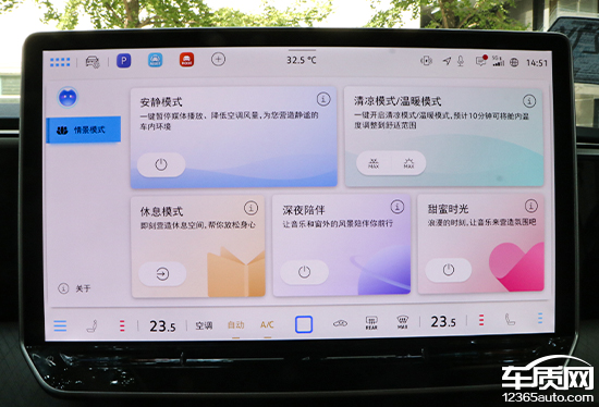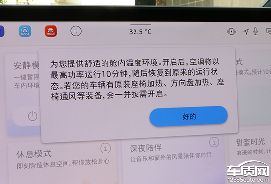 车机系统内置了丰富的情景模式,包括安静模式、清凉模式/温暖模式以及休息模式等。值得一提的是,每种模式都带有详细的文字说明,用户可以通过点击圆形的“i”标识进行查阅,细节设计颇为人性化。