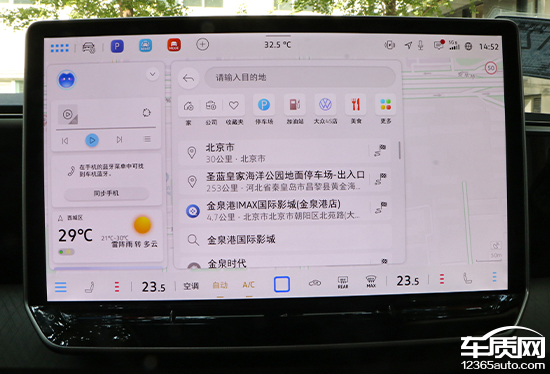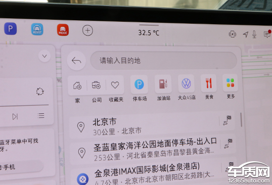 评测车的地图品牌为腾讯,其最大亮点是地图直接显示在桌面上,日常使用快捷简便。搜索栏位于左上角,支持多种输入方式。除了常规的家、公司、收藏夹外,系统还提供了丰富的快捷目的地选择,包括停车场、加油站、大众4S店以及美食等。