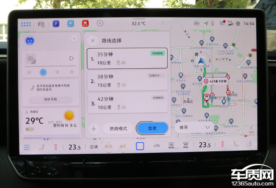 确认目的地后,系统会提供三条路线选择,基本信息较为丰富,包括行程用时、里程以及红绿灯数量等。基于车联网,地图界面还可以显示路线的拥堵情况,为驾驶员提供参考。
