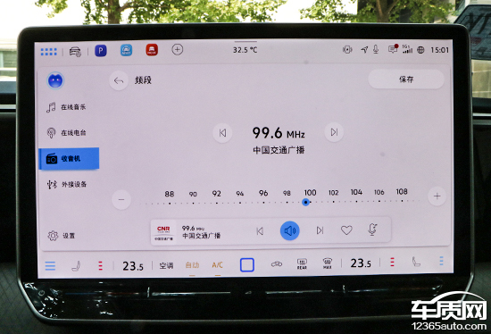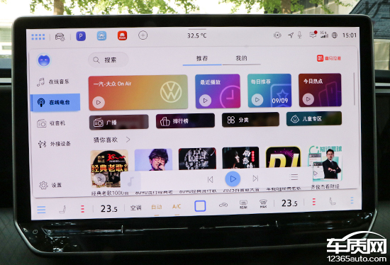 多媒体部分,车机系统提供原生FM/AM广播以及在线电台。收音机页面设计清爽简约,无论是查找还是收藏电台都非常方便。在线电台推荐页面内容相当丰富,拥有广播、排行榜、分类和儿童专区等多个标签。