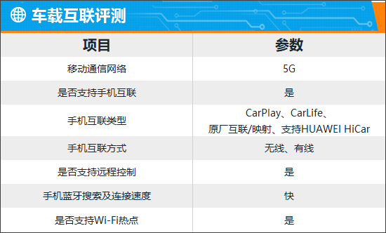 车载互联部分,评测车支持5G车联网以及手机APP远程功能,实测蓝牙的搜索及连接速度都很不错,体验感较好。手机互联方面,系统支持CarPlay、CarLife、原厂互联/映射以及HUAWEI HiCar,适配性极强,完全能够满足日常使用所需。此外,通过小京鱼APP进行绑定,用户还可以通过车机热点连接手机,从而实现投屏功能。
