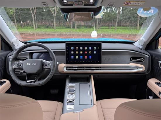 中控台布局简洁实用,15.6英寸中控屏尺寸刚刚好,开车时看导航、调模式很方便。空调控制区域并没有配备传统的机械按键,让中控台看上去更加清爽,同样也与北京越野旗下的主打“硬派越野”的BJ40(配置|询价)等车型的差异化用车场景。