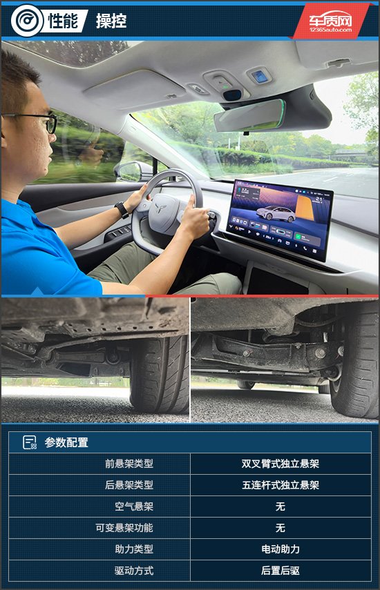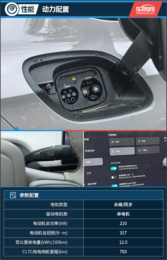 动力系统方面,评测车搭载后置单电机,电动机总功率210kW、总扭矩317N·m,匹配容量为85kWh的磷酸铁锂电池,CLTC纯电续航里程为750km,百公里耗电量仅为12.5kWh/100km。