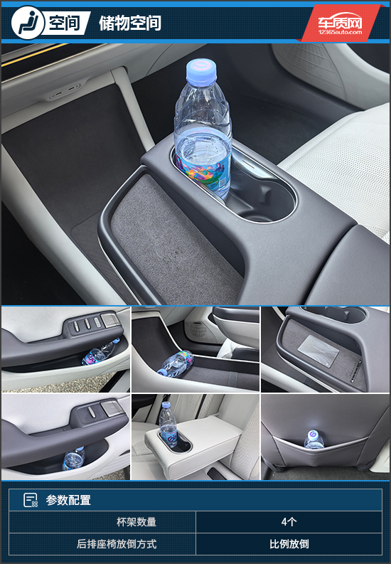 储物空间方面,评测车共有4个杯架且均有限位器,储物槽布局合理且容积可观,前后排乘客的随身物品均有合适地方放置。