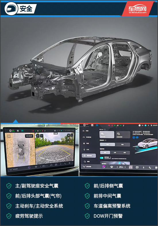 评测车采用“9H4M”笼式车身结构,整车高强度钢占比76%。被动安全方面,提供主/副驾驶座安全气囊、前/后排侧气囊、前/后排头部气囊(气帘)、前排中间气囊;主动安全方面,具备主动刹车/主动安全系统、车道偏离预警系统、疲劳驾驶提升等功能,时刻为用户出行安全提供保障。