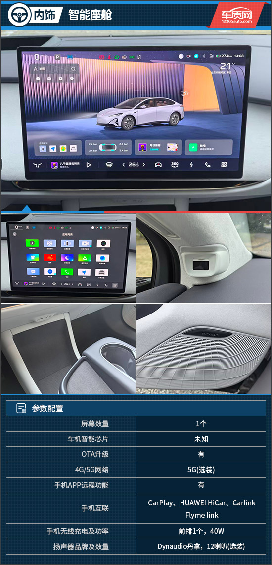 配置上,评测车配备15.6英寸中控屏,分辨率达到2.5K,车机支持CarPlay、HUAWEI HiCar、Carlink等多种手机互联方式,具备OTA能力并选装了5G网络。实际体验过程中,系统逻辑简单且响应十分迅速。值得一提的是,评测车还有手势控制、面部识别、声纹识别等年轻消费者喜闻乐见的科技配置。中控台上方的手机槽拿放手机十分方便,同时具备40W手机无线充电功能。