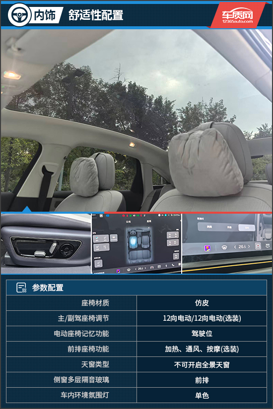 舒适性配置方面,评测车虽然采用仿皮座椅材质,但座椅填充物柔软且设置了透气孔,再配合选装的前排座椅加热、通风、按摩功能,就算长途久坐也不会觉得疲惫。天窗类型虽然为不可开启全景天窗,但车内透光率表现很不错,加上前排侧窗多层隔音玻璃,可以为用户提供一个较为敞亮静谧的内部环境。