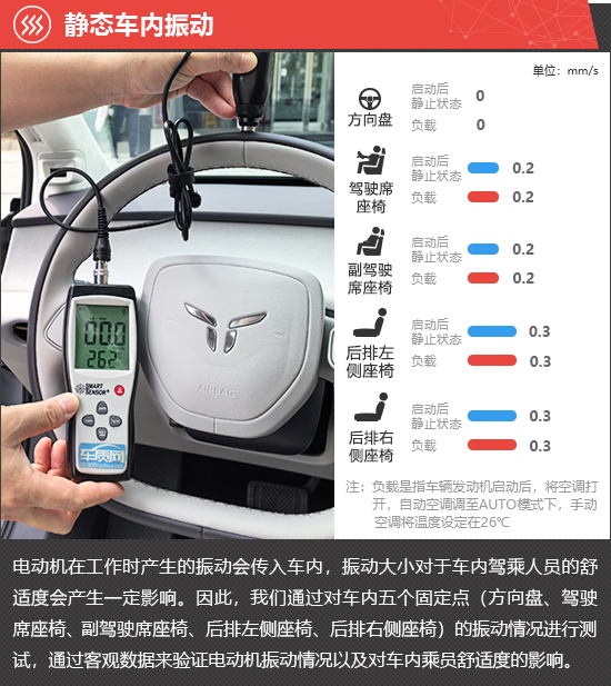在静态车内振动测试环节,启动后静止和负载两种状态下,2025款红旗天工05方向盘位置的振动数值始终为0,后排座椅的振动数值略高于前排座椅,实际体感不明显。