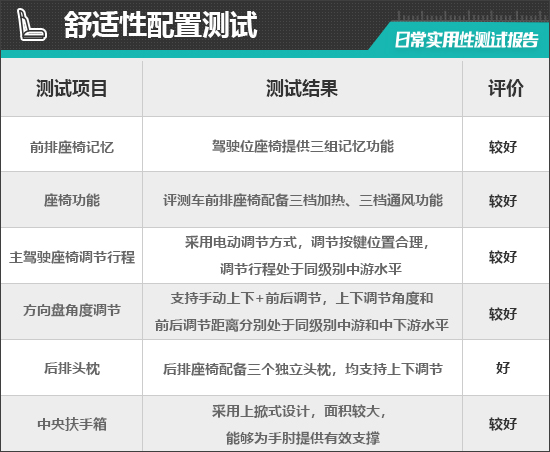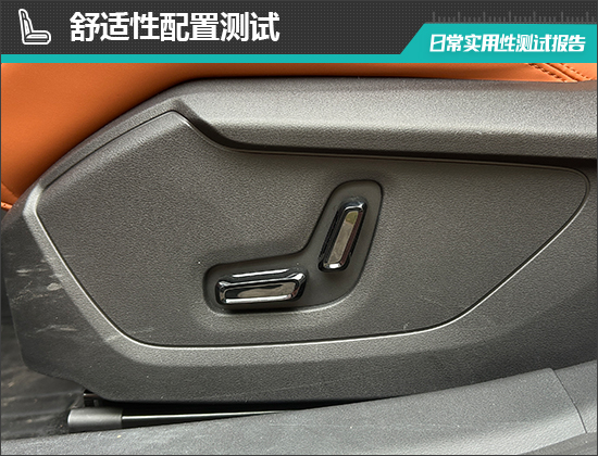 座椅方面,评测车主驾驶座椅电动调节按键位于座椅侧面,调节按键位置合理。此外,评测车驾驶位座椅支持三组记忆功能,前排座椅配备三档通风和三档加热功能,舒适性配置较好。