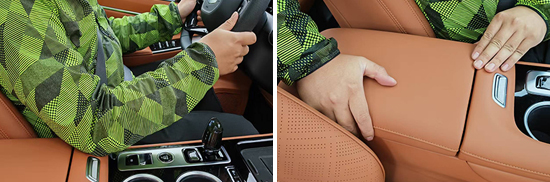 前排中央扶手采用上掀式设计,造型规整且面积比较大,表面为软性材质包裹,触感不错。在驾驶过程中,能够为驾驶者手肘提供有效支撑。