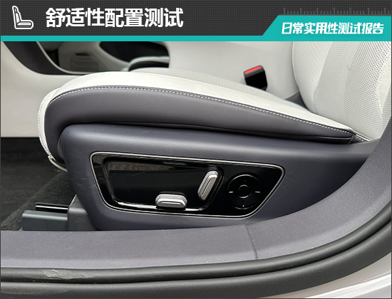 舒适性配置方面,评测车的前排座椅调节按键分别位于座椅左右两侧,位置合理且操作便捷。同时,驾驶位配备电动座椅记忆功能,前排座椅还选装了加热、通风和按摩功能,后排座椅选装了加热功能,整体舒适性表现可圈可点。