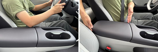 评测车前排中央扶手为上掀式设计,采用了软质材质包裹,触感舒适。并且驾驶者在标准姿势驾驶时,可以为肘部提供支撑。