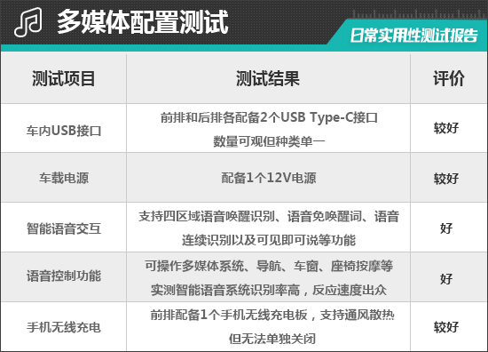 评测车在前排配备了1个40W手机无线充电板,位于中央扶手前方,位置设计合理,驾驶员拿放手机方便。无线充电板还配备散热口,可以有效降低充电温度,但不支持关闭,稍有遗憾。