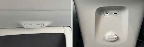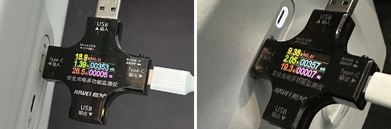 在车内USB接口方面,评测车前后排各配有2个USB Type-C接口,数量可观但种类单一。同时,车内还配备1个12V电源。此外,我们对USB接口进行了测试,前排USB Type-C接口的测试成绩为18.9V、1.39A、26.5W左右;后排USB Type-C接口的测试成绩为9.38V、2.05A、19.3W左右。